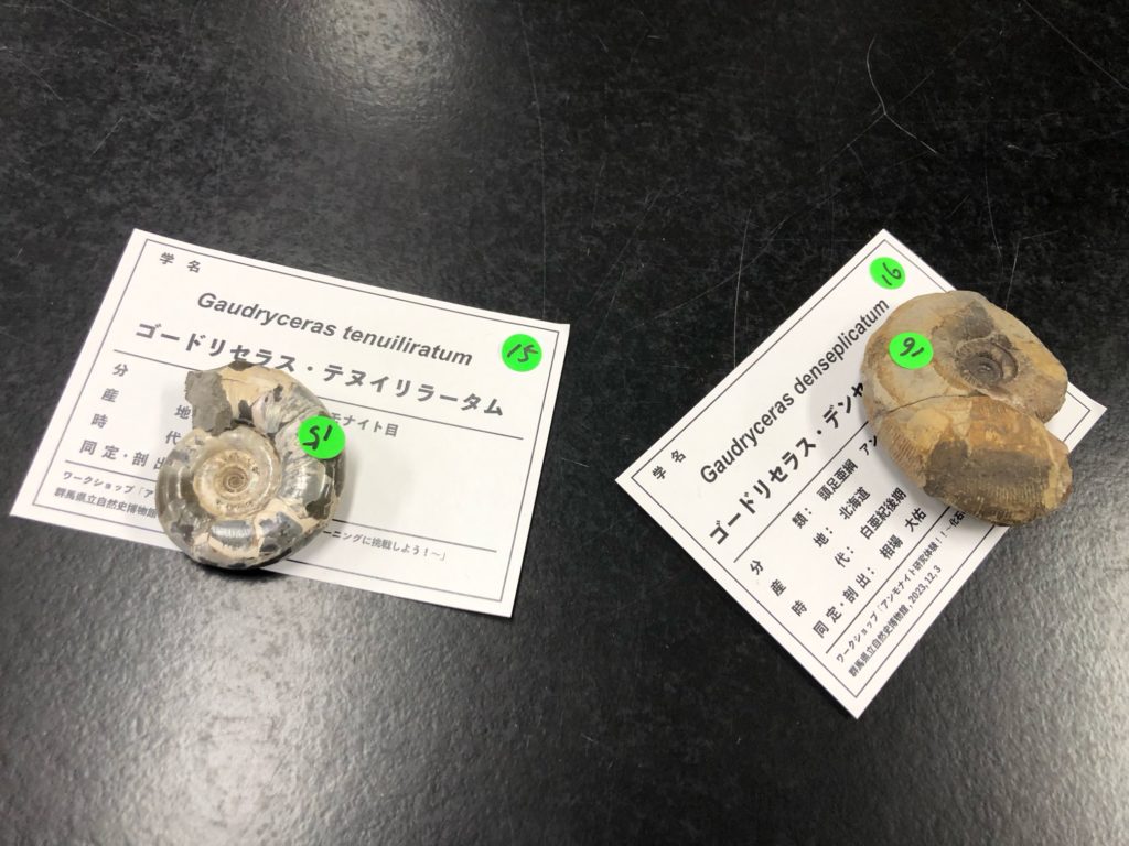 実験室後方の机に並んだアンモナイトには番号が振られていて、その中から近い特徴のものを見つけます。