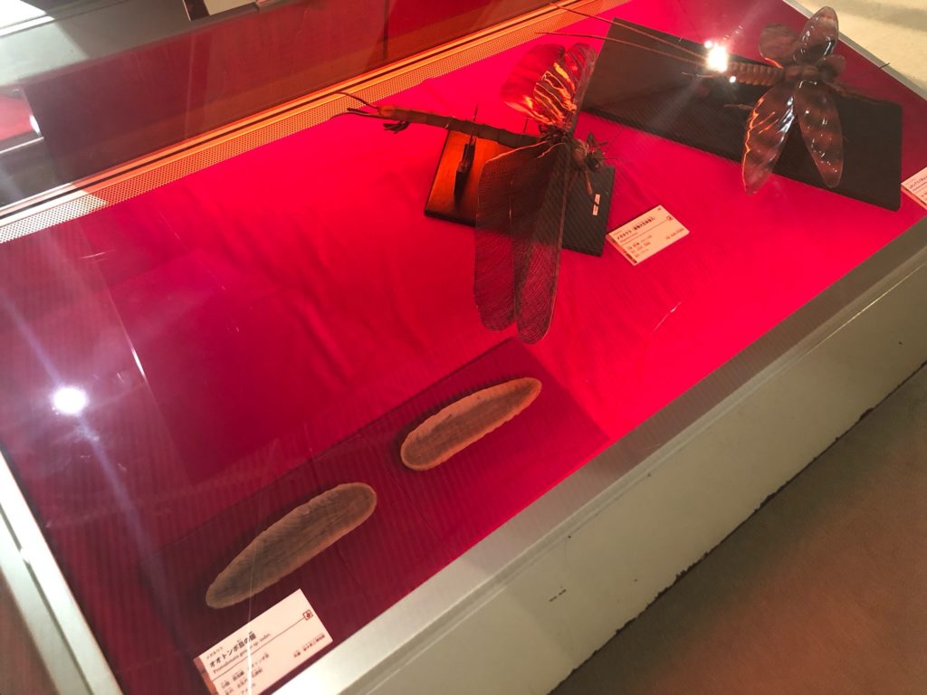 メガネウラの実物大生体復元とムカシアミバネムシの実物大生体復元の2つが展示されていたショーケースにオオトンボ目の翅が追加されました。