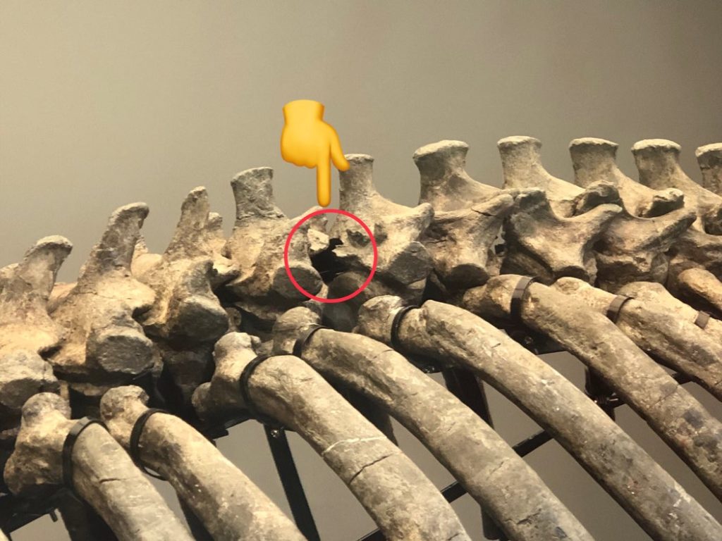 首から腰まで残っていて、骨折痕や背骨に付着するサメの歯などが確認できます。