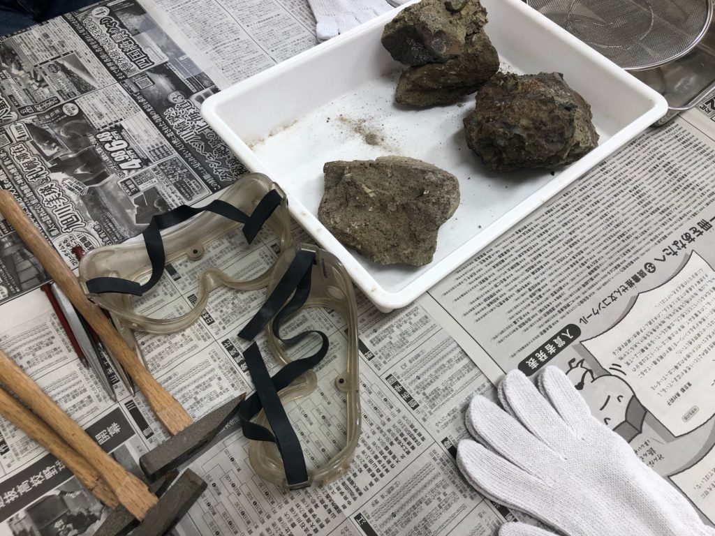 1500万年前の葛袋の岩石をタガネとハンマーで割って化石を見つけ出します。
