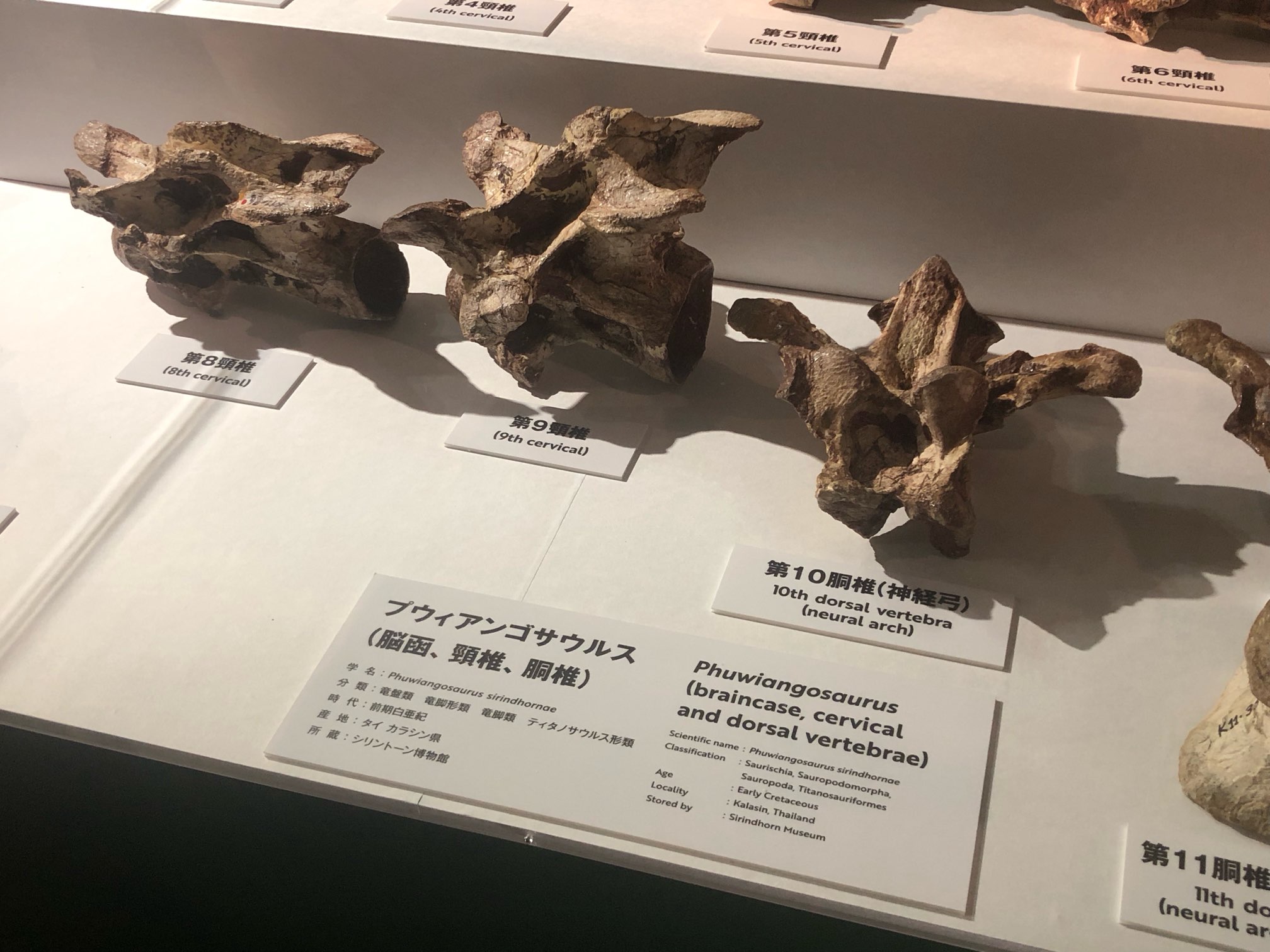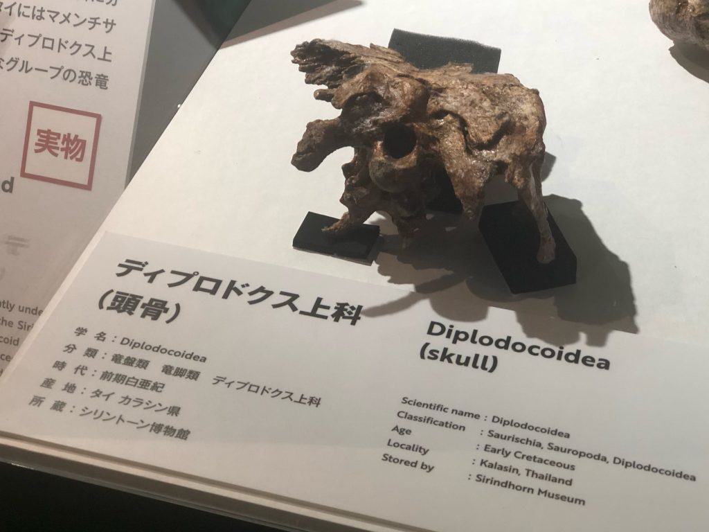 ディプロドクス類の頭骨やプウィアンゴサウルスの頸椎や胴椎など、実物化石とされるものがショーケースの中に展示されていました。