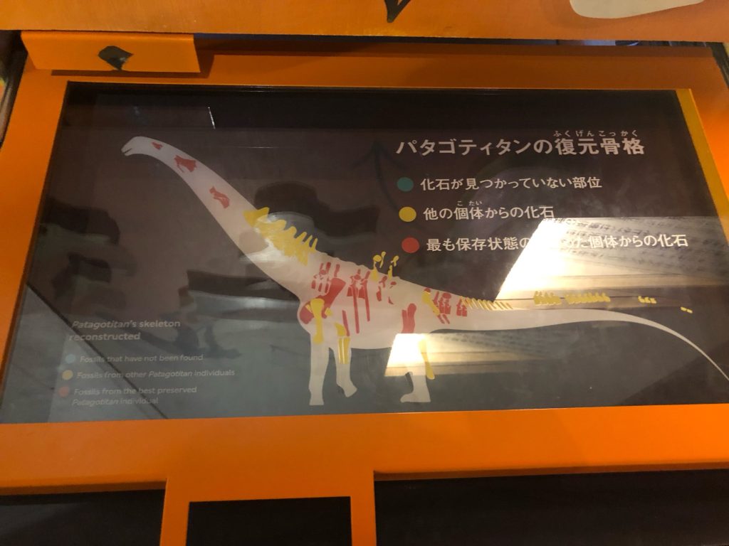 引き出しになっている展示ではパタゴティタンの化石に関して見つかっている部位を示すものになっていました。